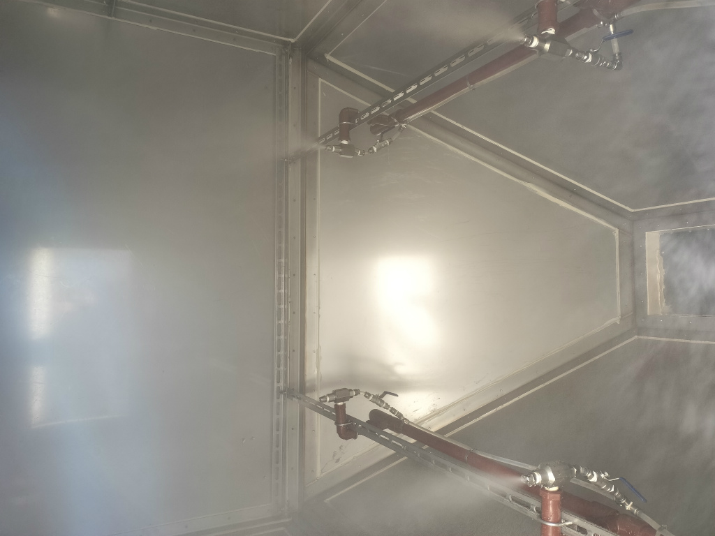 試運転調整時に噴霧状態を確認するため、大量の水を受け止めながら噴霧量の調整、噴霧ノズルの角度調整などを行い、満足のいくメンテナンスが無事終了しました。