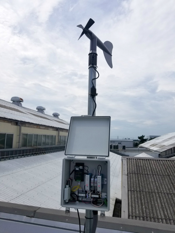 工場が広いので風向きも方角によって異なるので、一番背が高い工場建屋の屋上に1か所と東南と南東に風向風速計を2か所設置しました。