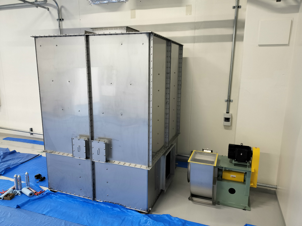 弊社デオキーパー脱臭装置LEV150型を2台設置している最中となり、ほぼほぼ組立が完了し、活性炭の投入作業を行っております。